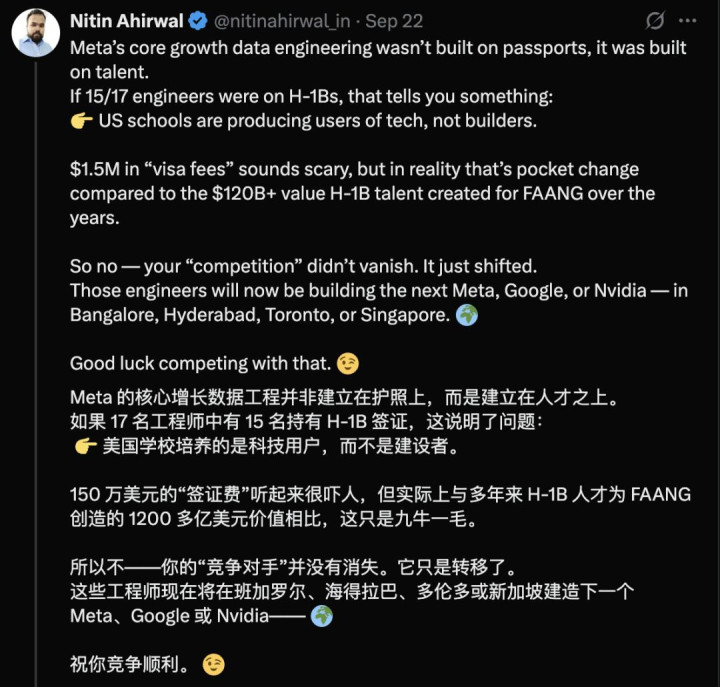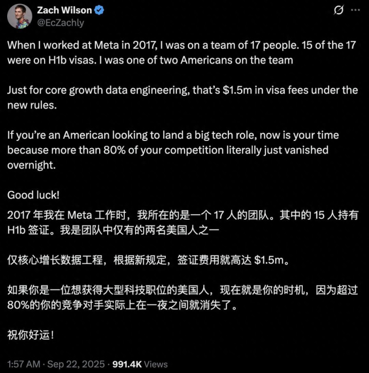 正当许多人为新令担忧时,一位前Meta工程师Zach Wilson在X平台上的发帖,点燃了大家关于H-1B新规的热烈讨论。