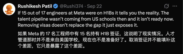 Wilson的帖子,还暴露了美国在本土科技人才上的缺口,网友Rushikesh Patil评论道: