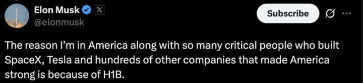 「我之所以在美国,以及和许多关键人物一起建立了SpaceX、Tesla和数百个使美国强大的公司,是因为H-1B。」