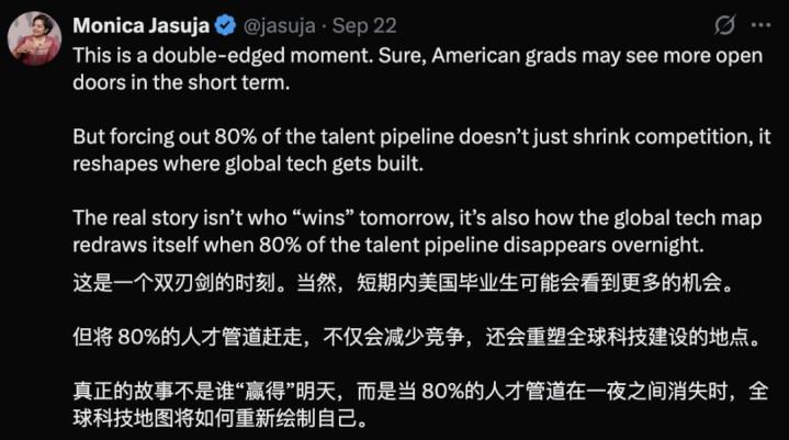 在Monica Jasuja看来,新改革是一把「双刃剑」,短期内可能为美国毕业生创造更多的机会,但也可能将80%的「人才管道」赶走,这将带来对全球人才格局的重塑。